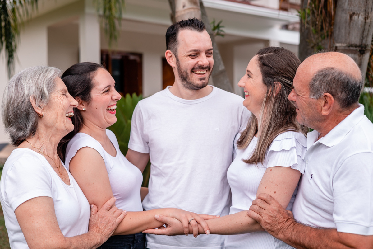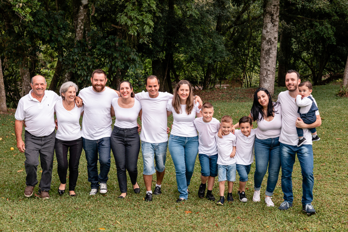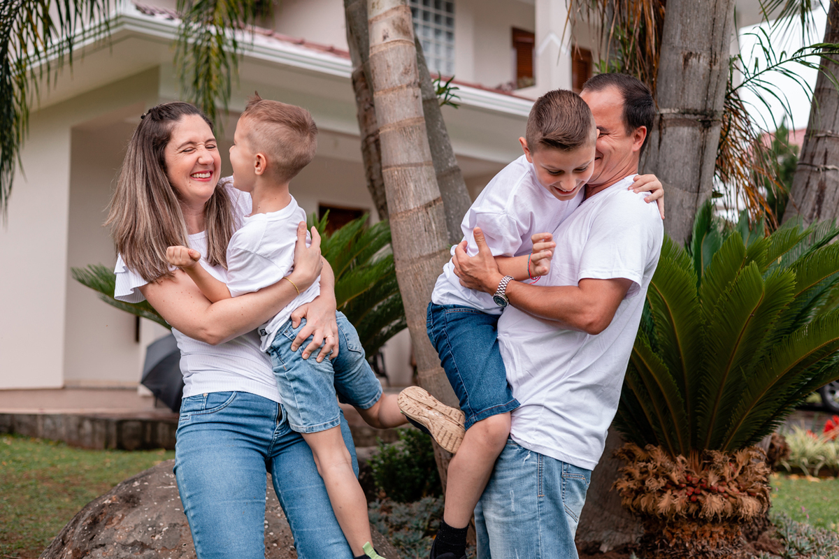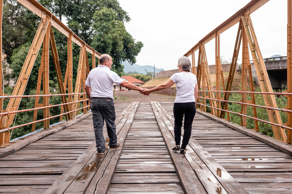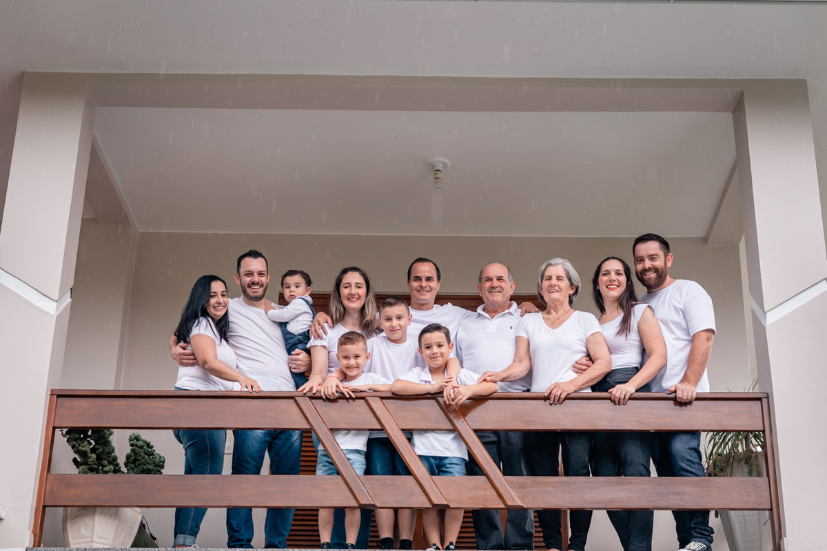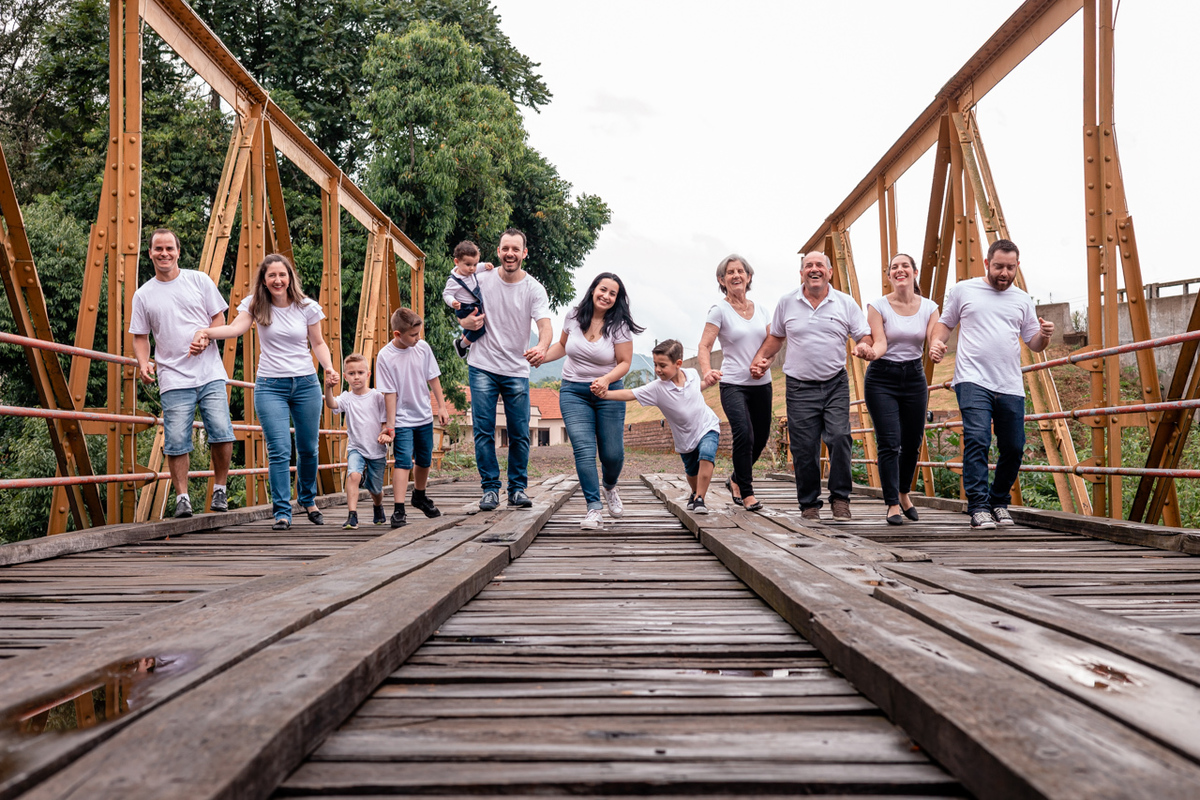 Nem a chuva tirou a alegria da família Tebaldi que escolheu a residência dos pais e a tradicional ponte de ferro para registrar e guardar lindas memórias.