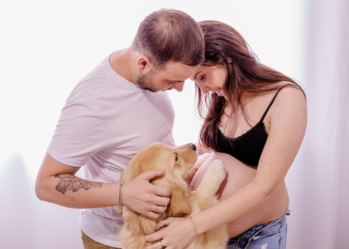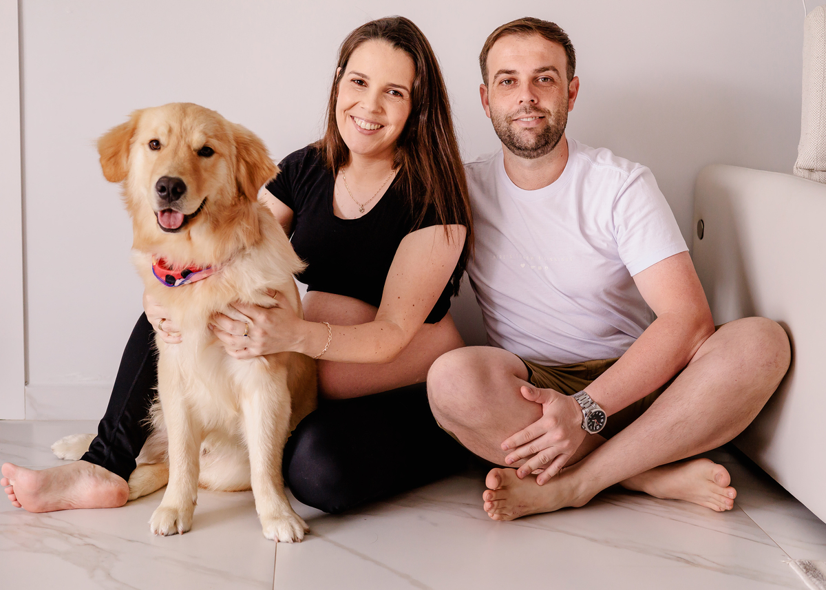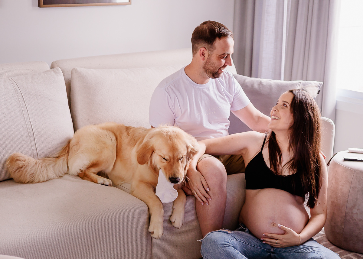 O ensaio intimista foi realizado na casa da família e teve a participação especial do mano de quatro patas.